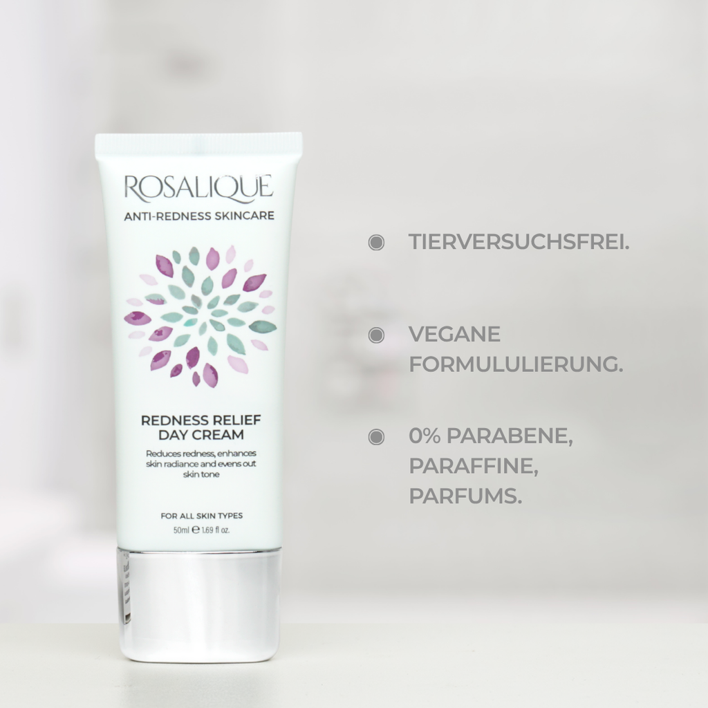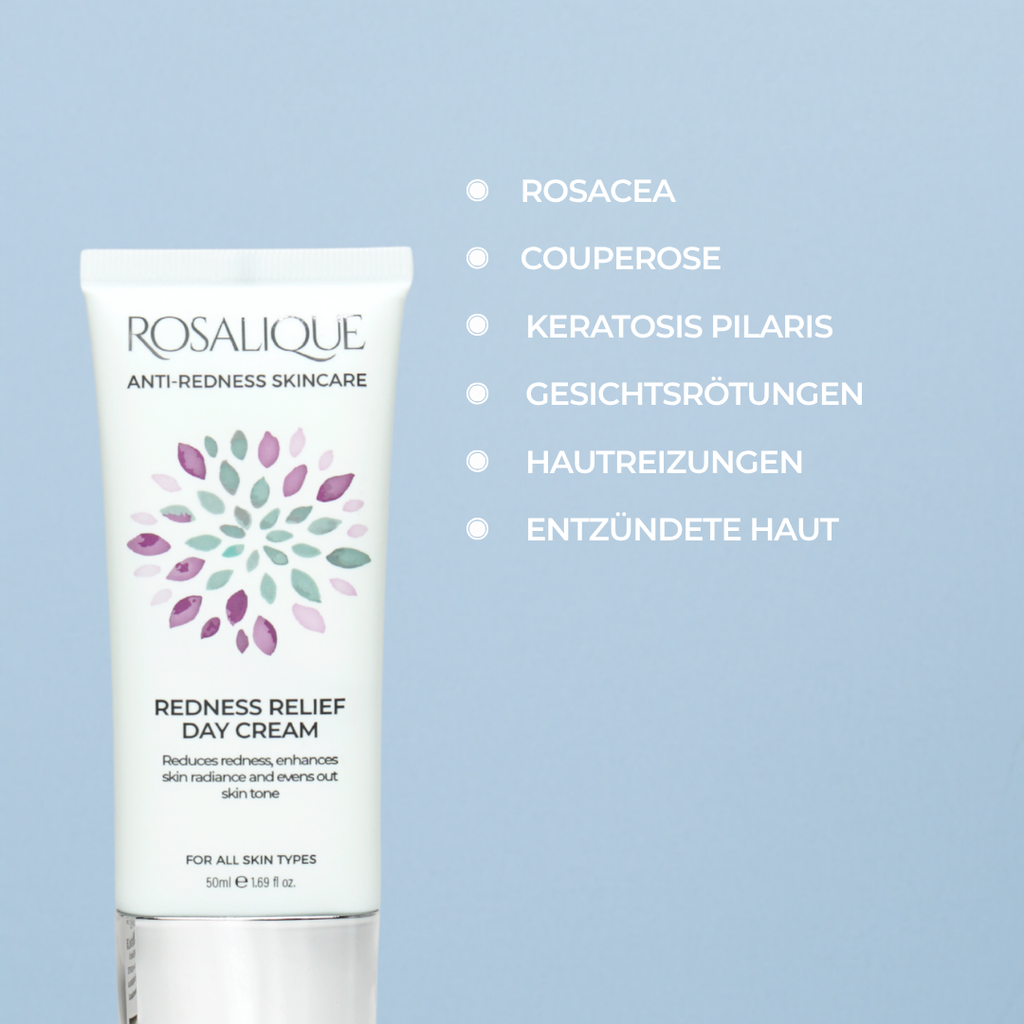 Die Rosalique Redness Relief Day Cream wurde speziell für empfindliche und zu Rötungen neigende Haut entwickelt. Mit klinisch erprobten, rötungsmindernden Wirkstoffen und natürlichen Feuchtigkeitsspendern beruhigt und pflegt diese Creme Ihre Haut den ganzen Tag lang. Sie lindert Rötungen, fördert die Ausstrahlung und gleicht den Hautton aus, während sie gleichzeitig dazu beiträgt, die Hautbarriere wiederherzustellen und für langanhaltende Feuchtigkeit zu sorgen.